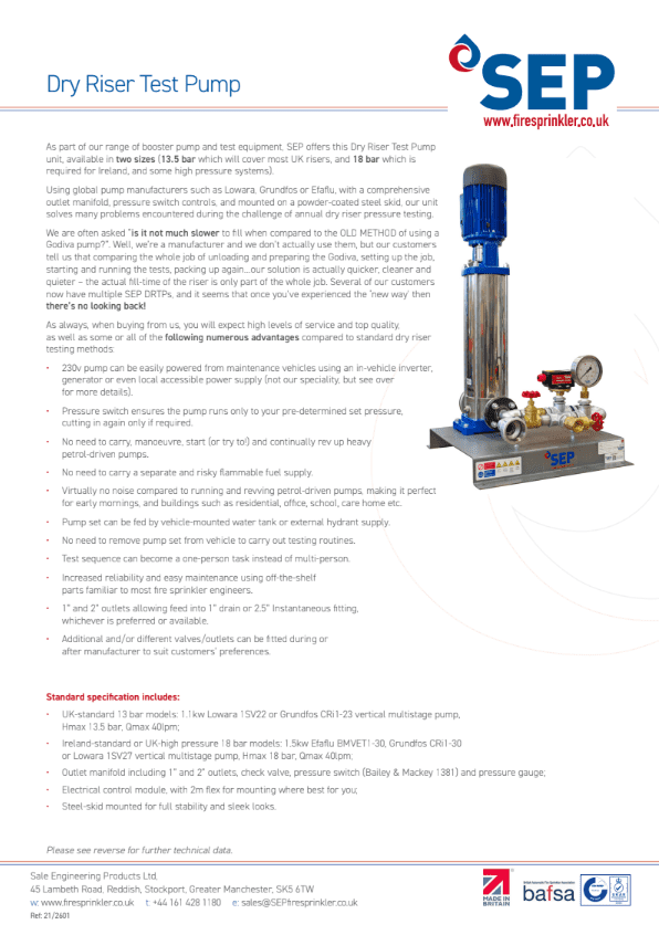 As part of our range of booster pump and test equipment, SEP offers this Dry Riser Test Pump unit, available in two sizes (13.5 bar which will cover most UK risers, and 18 bar which is required for Ireland, and some high pressure systems).