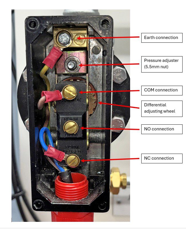 - Both the pressure adjuster (5.5mm nut) and differential adjuster (notched wheel) wind clockwise to reduce, and anti-clockwise to increase. This is NOT marked on the switch! Also note that turning too far anti-clockwise could permanently damage the switch.